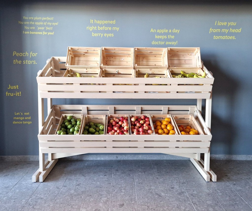 In a project where the customer really wanted to highlight and promote this, we chose to make the entire solution much more attractive and fun. Instead of talking about why it is good to eat fruit, we decided to use funny quotes with a bolder color on the wall foil and to bring out a piece of furniture that also gave the fruits an extra appeal with a reminder of markets. All this according to the suggestions and ideas by Space in Order.
